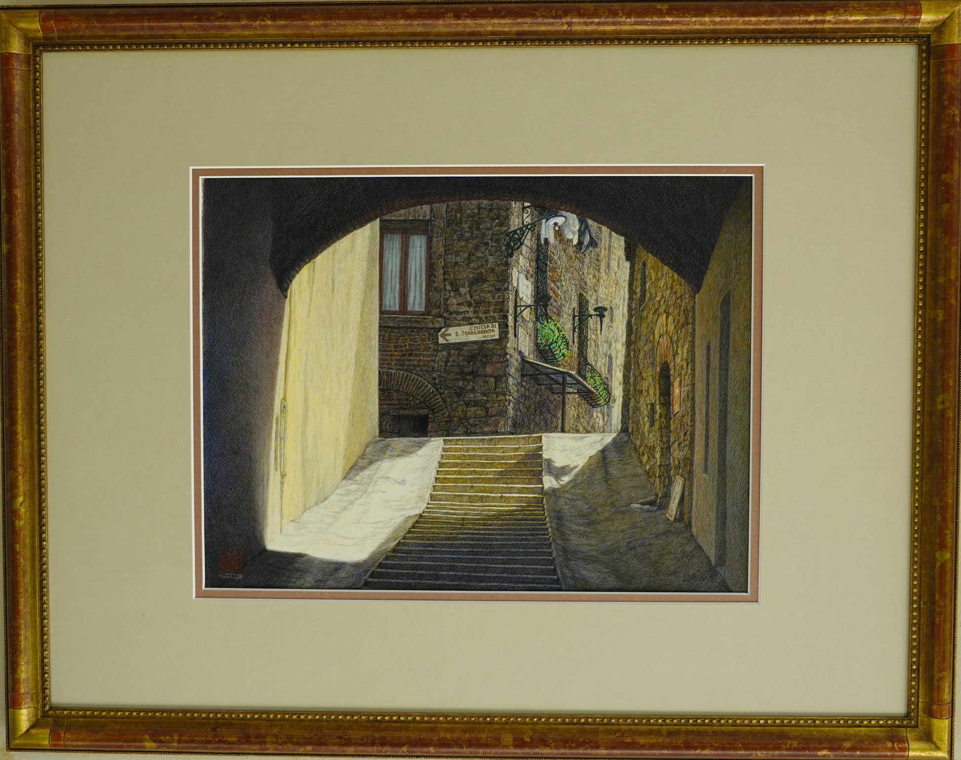 Il soggetto di questo dipinto è il sentiero che corre sotto gli edifici, salendo da Piazza Garibaldi al centro fino alla Fortezza Albornoz a sud della città.