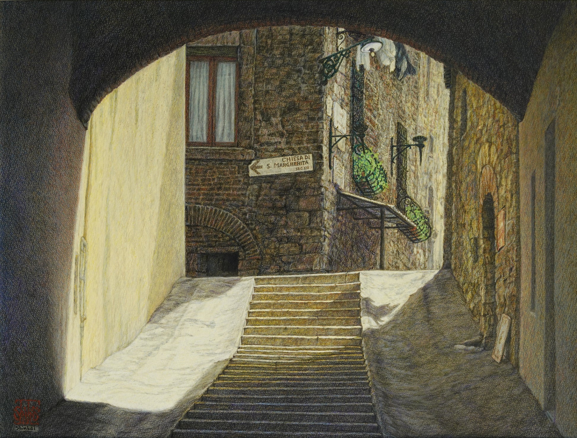 Mi ha attirato quel bel sentiero con i gradini in pietra e attraversati dalla luce del sole e ho voluto disegnarlo.