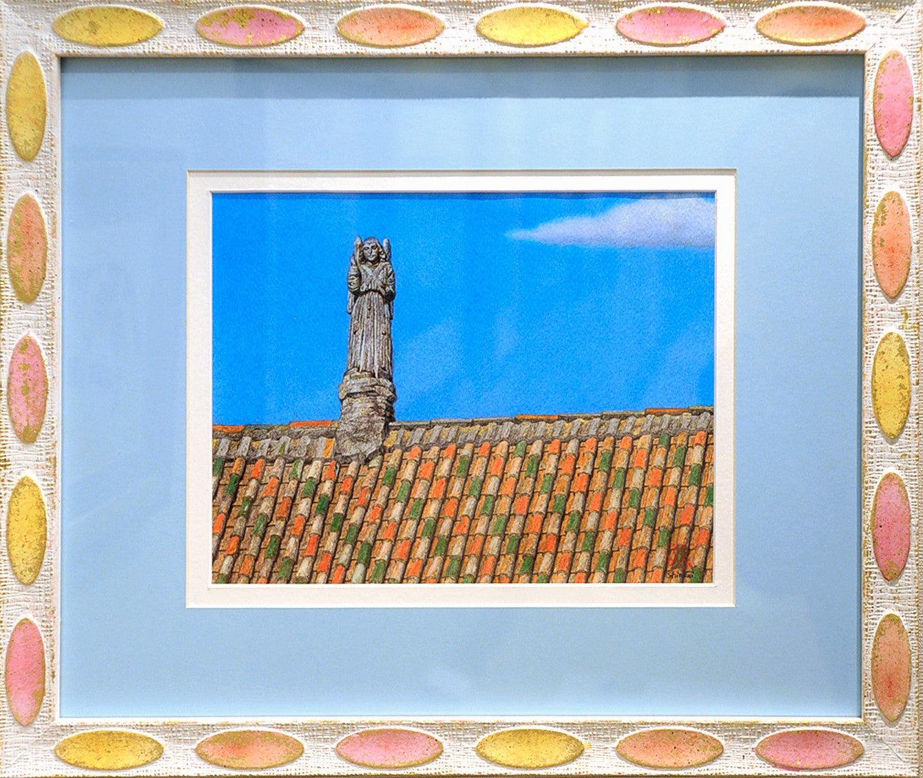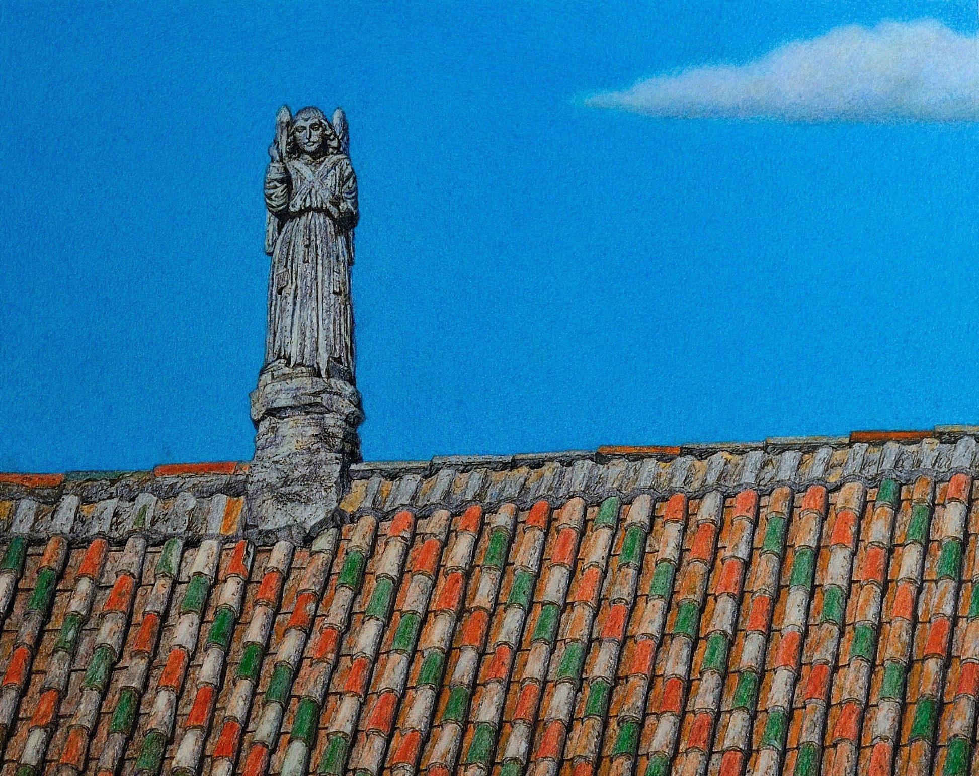 Il colore delle tegole del tetto non è solo arancione come il resto della zona, ma anche verde e tonalità chiare della pelle.