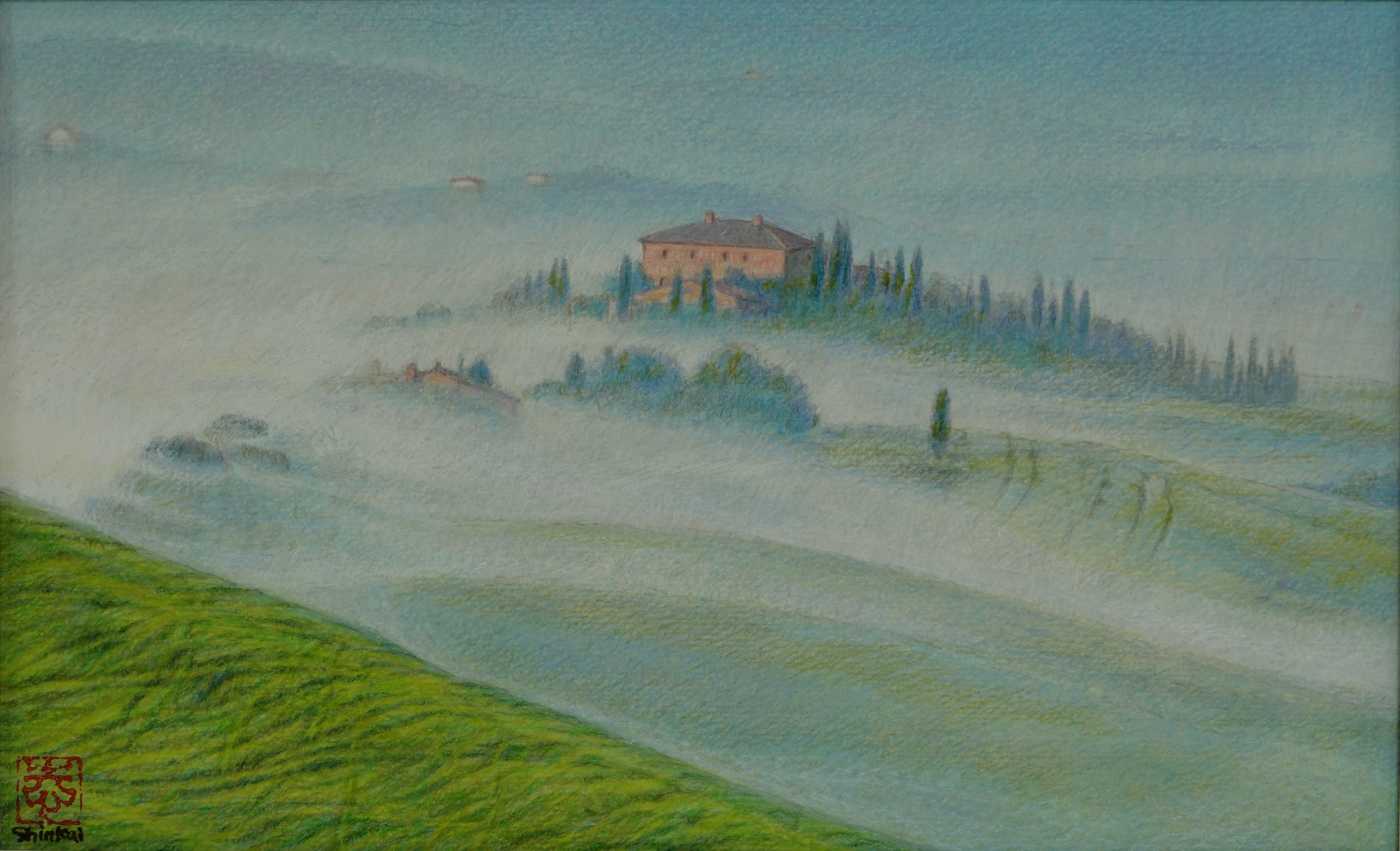 Una nebbia bianca che si alzava dalla profonda valle sulla sinistra scorreva tra i solchi della terra, e la grande fattoria rosa in lontananza brillava al sole del mattino, creando uno scenario davvero meraviglioso.