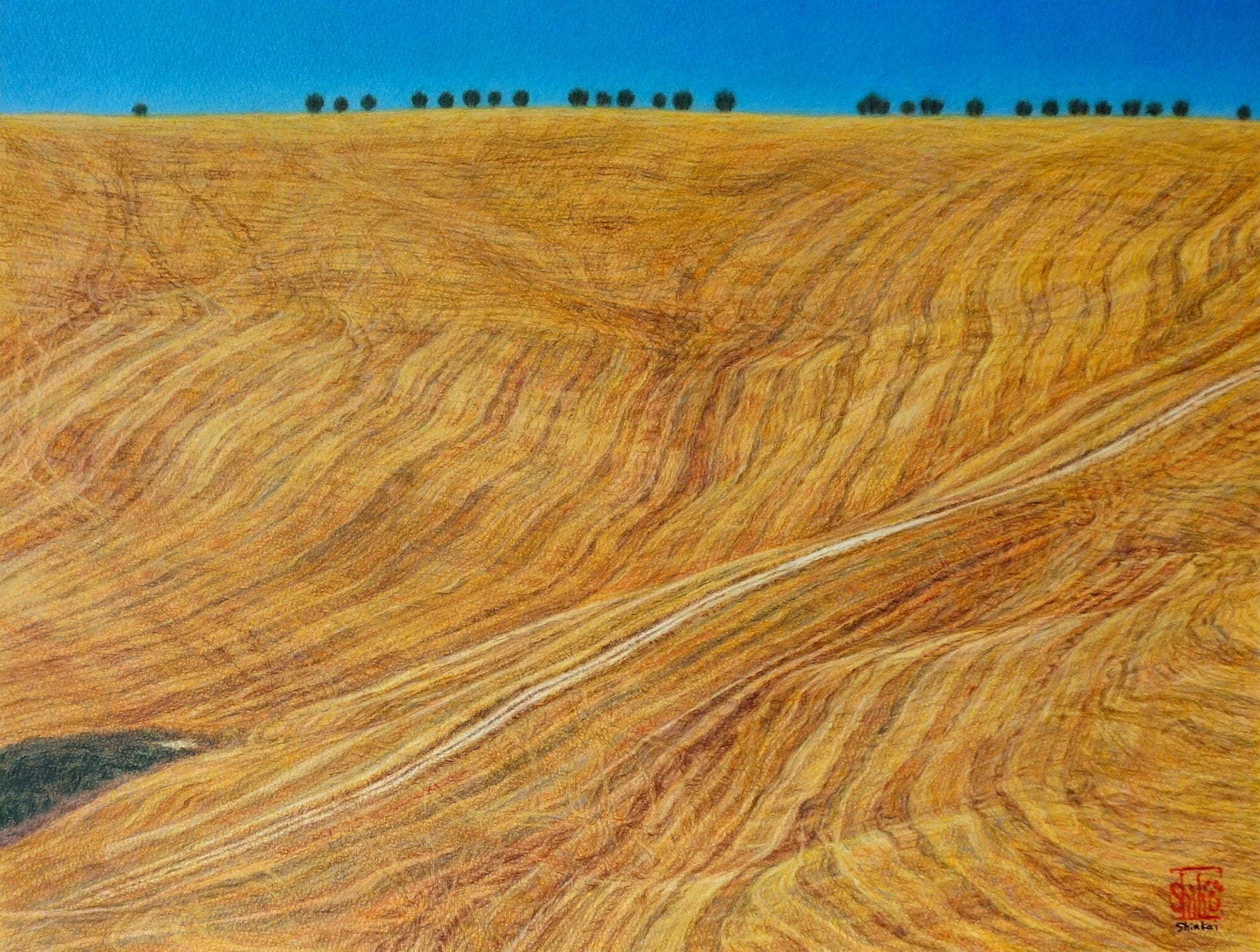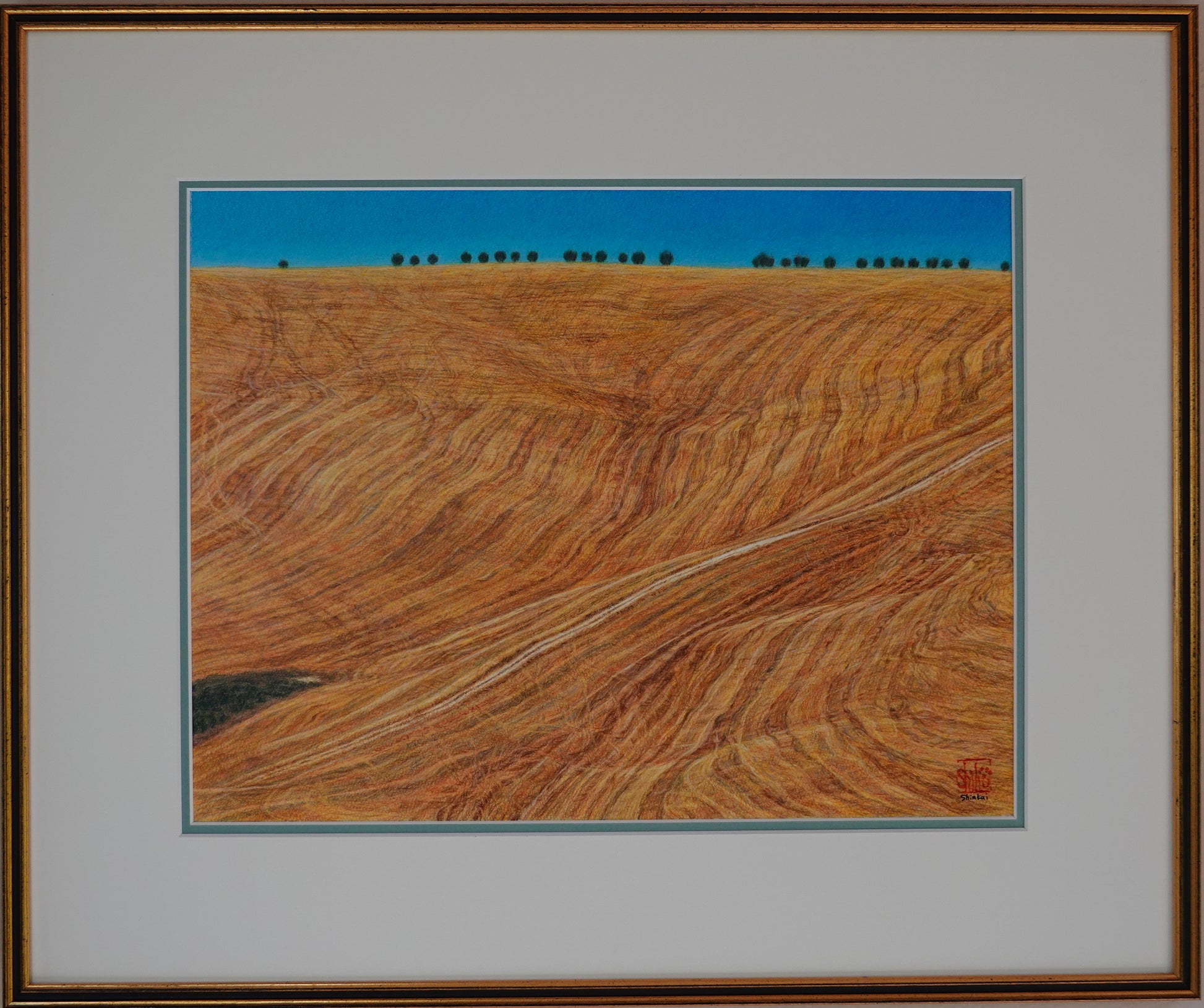 Sul lato ovest della strada si estende una lunga valle e le tracce dei trattori sono chiaramente visibili nei campi di grano già mietuti.