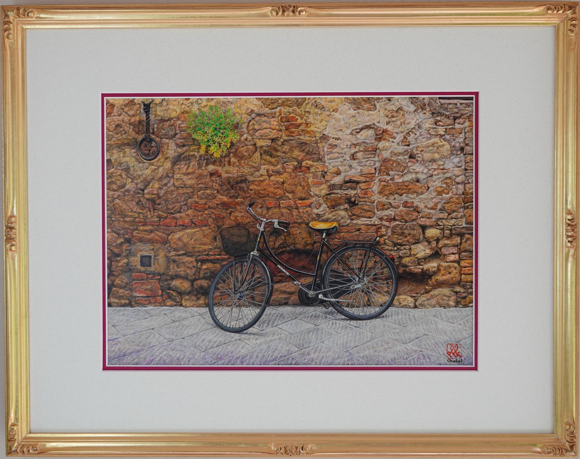 Il motivo raffigura una bici apposta di fronte al fragile tufo marrone, caratteristico della vecchia Pienza.