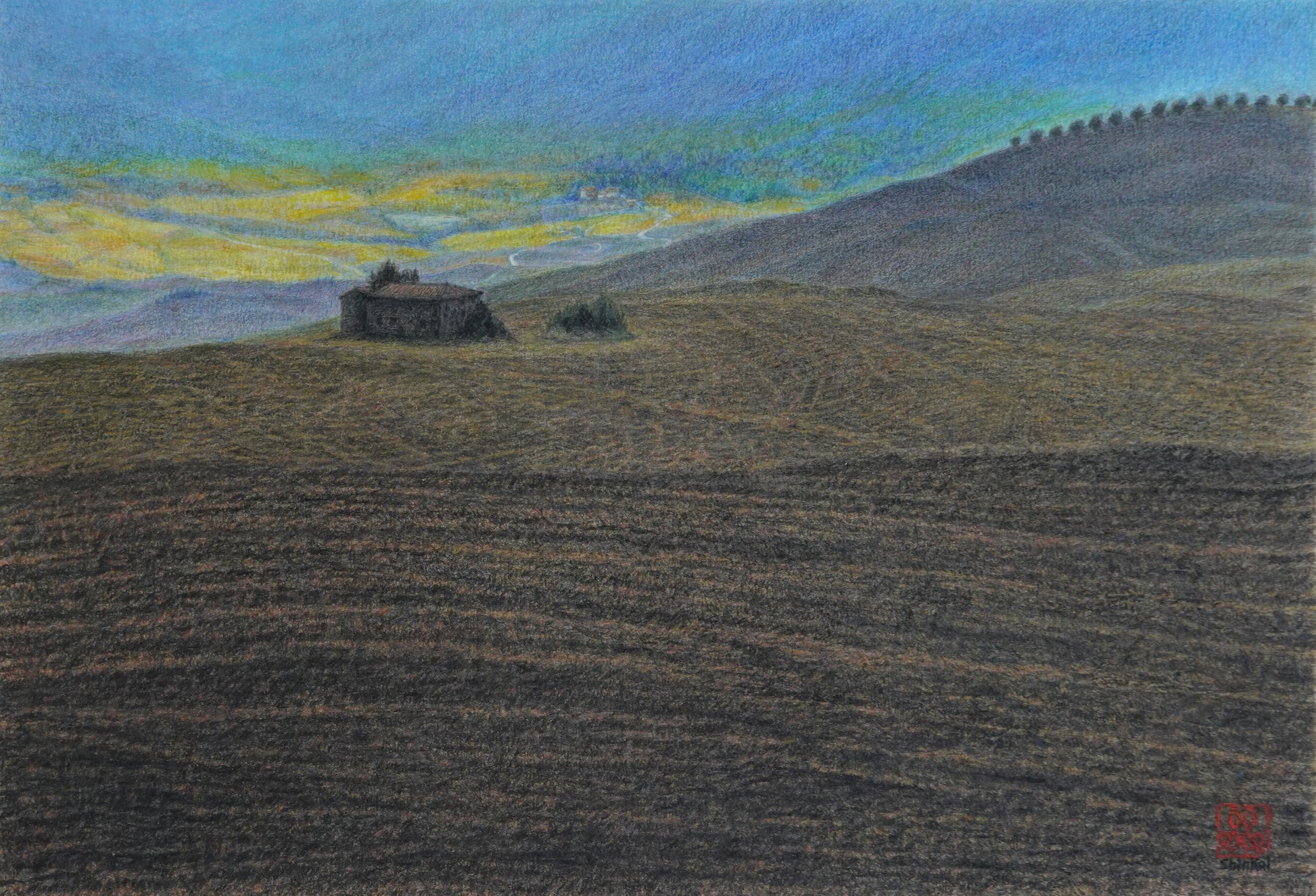 Nella luce del pomeriggio, in primo piano si vede un campo desolato con solchi ondulati e rimane solo una vecchia fattoria abbandonata.