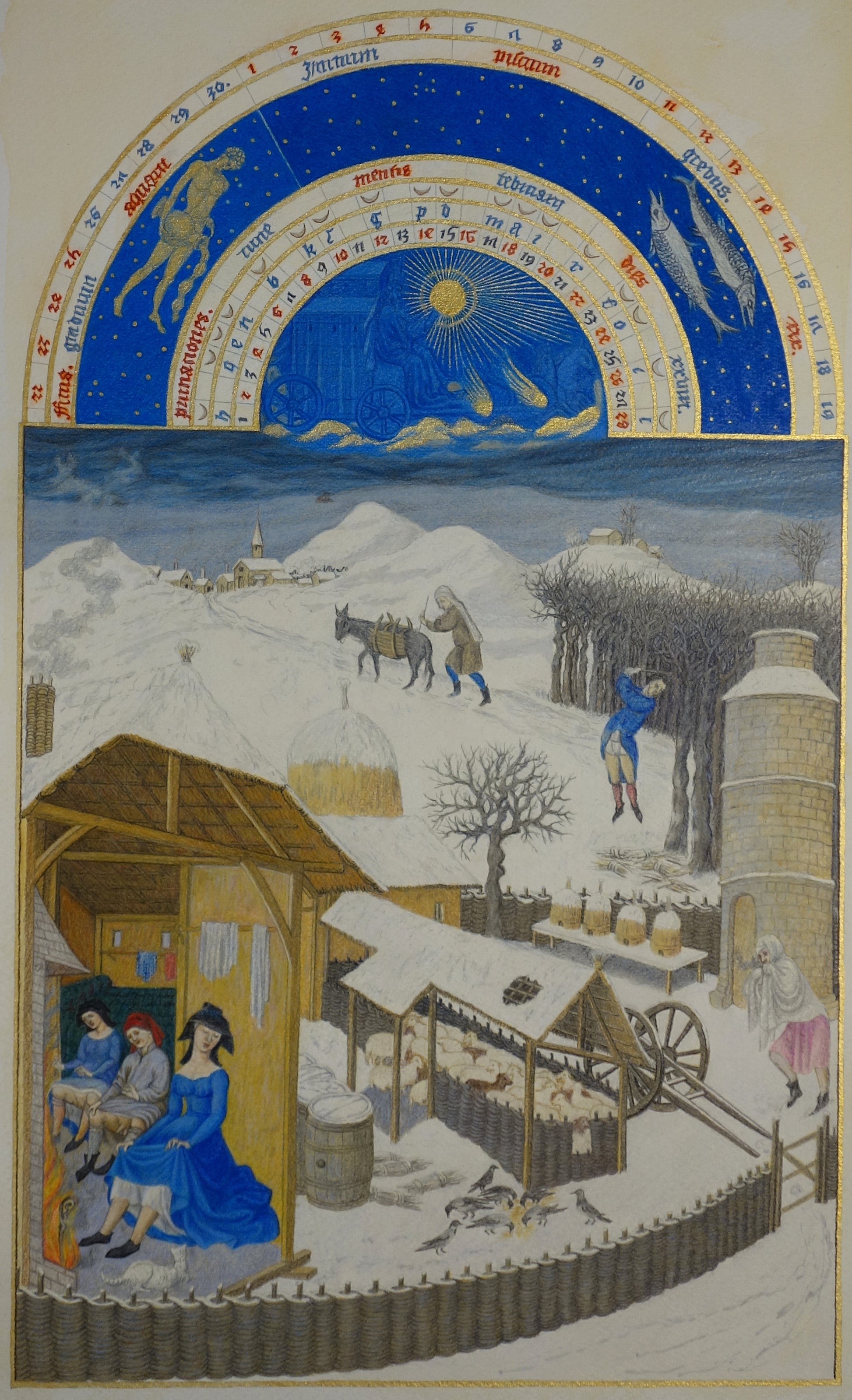 Tre anni fa ho finalmente realizzato il sogno di una vita: copiare il calendario di gennaio dal "Magnifico Libro d'Ore del Duca di Berry" e questa volta ho dipinto il paesaggio innevato di febbraio.