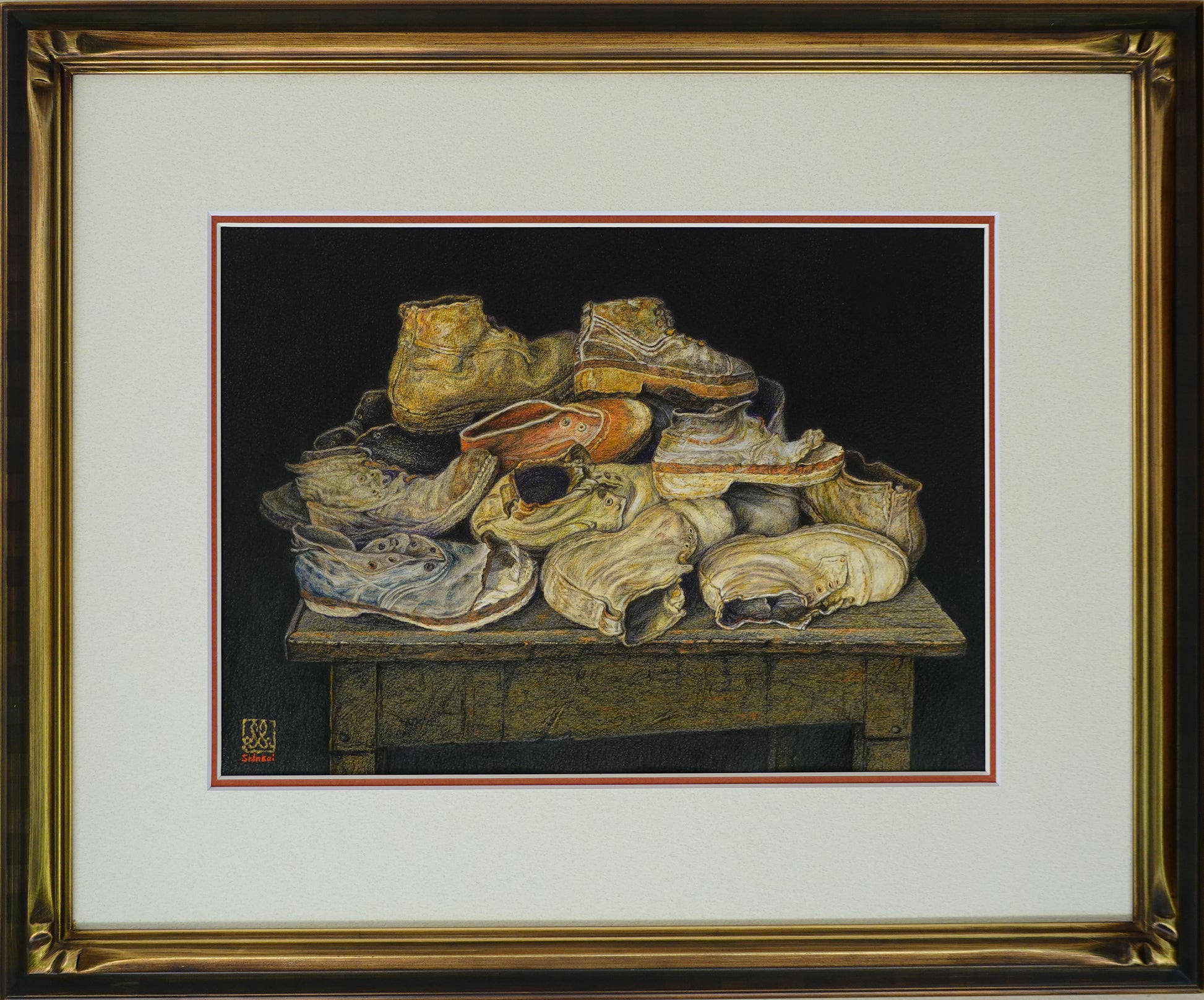Questo motivo di vecchie scarpe ammucchiate su un semplice tavolo fatto a mano l'ho trovato anche nel museo.