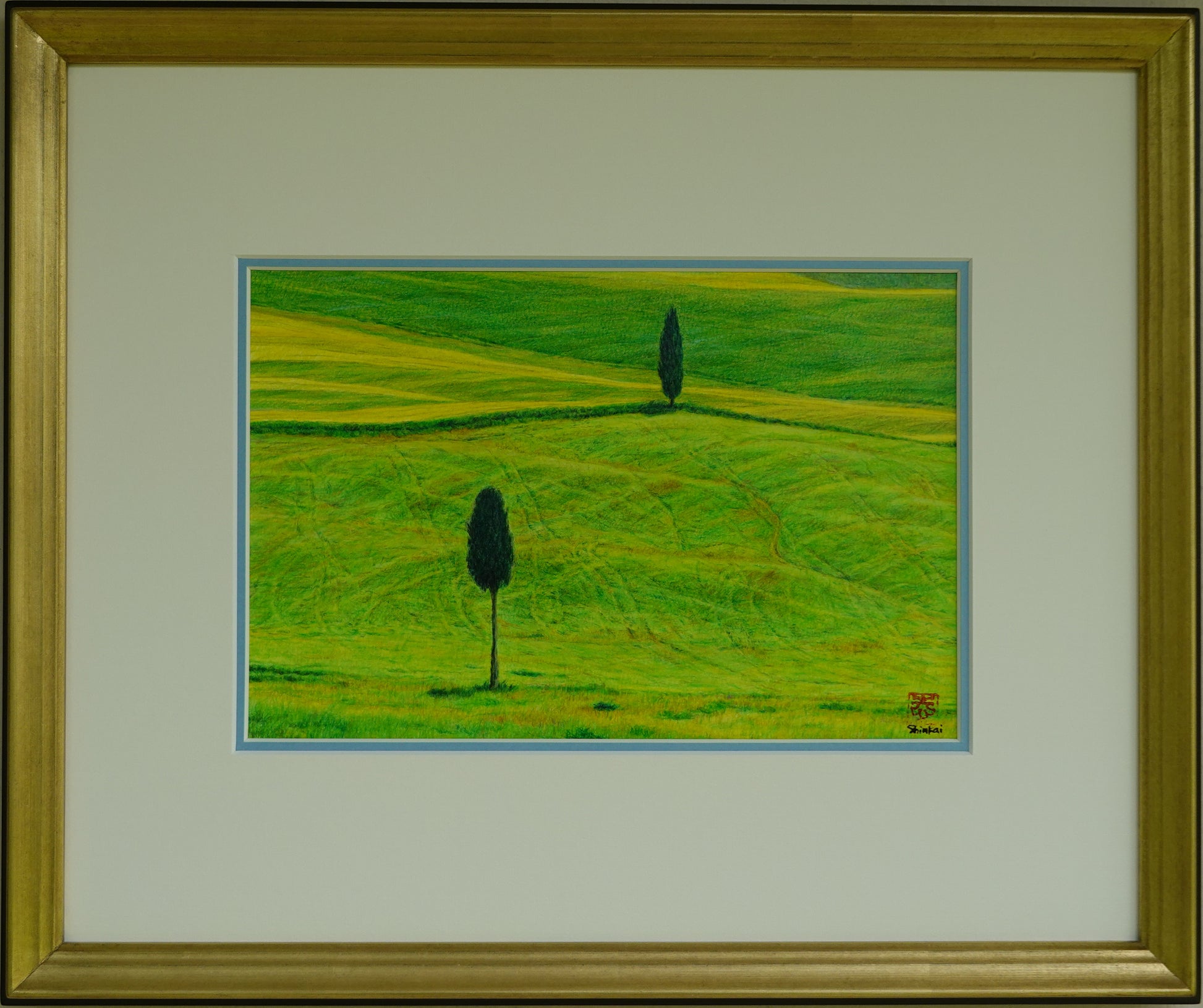 Dopo aver percorso due volte su e giù un ripido pendio, ad arrivata a due cipressi in un campo, che sono il soggetto di questo disegno.